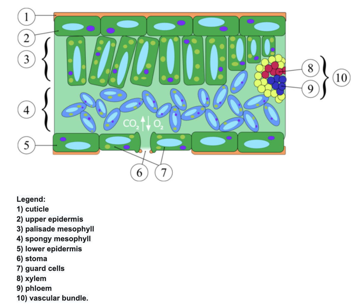 🔹 Spongy cells: help with gas exchange and store water. - Chloroplasts contain chlorophyll, a green pigment that captures sunlight.