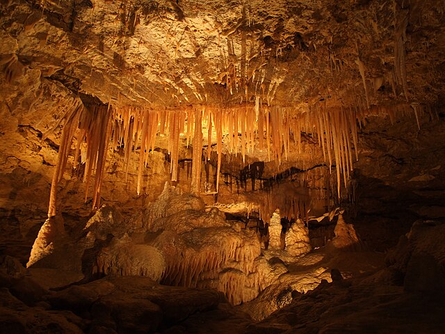 Cave Formations (Speleothems): Water dripping through the cave ceiling leaves behind dissolved calcite, which slowly recrystallizes into formations: