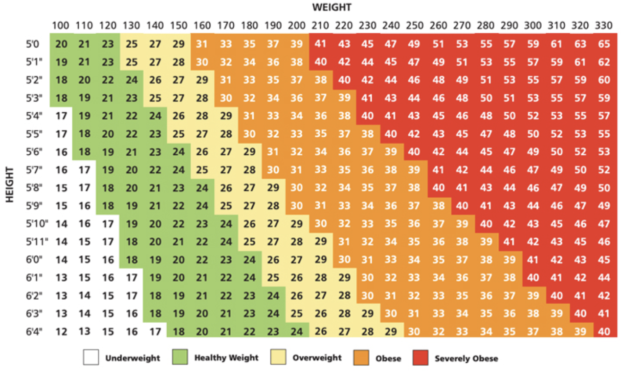 - Healthy Range: The healthy range for BMI is between 18.5 and 24.5. Anything below 18.5 is considered underweight, and anything over 24.5 is considered overweight or obese.