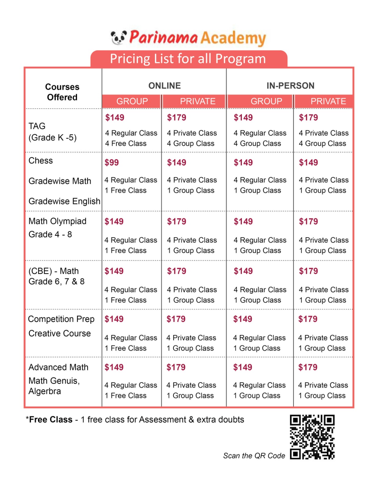 | 1 Subject | Once a week (4 classes) | $179 | Subscribe |